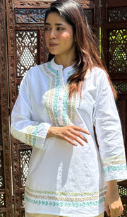 A: A chikan kurti set generally features a shorter top (kurti), while a chikan kurta set includes a longer kurta. Both are beautifully embroidered and available at Nazrana Chikan.