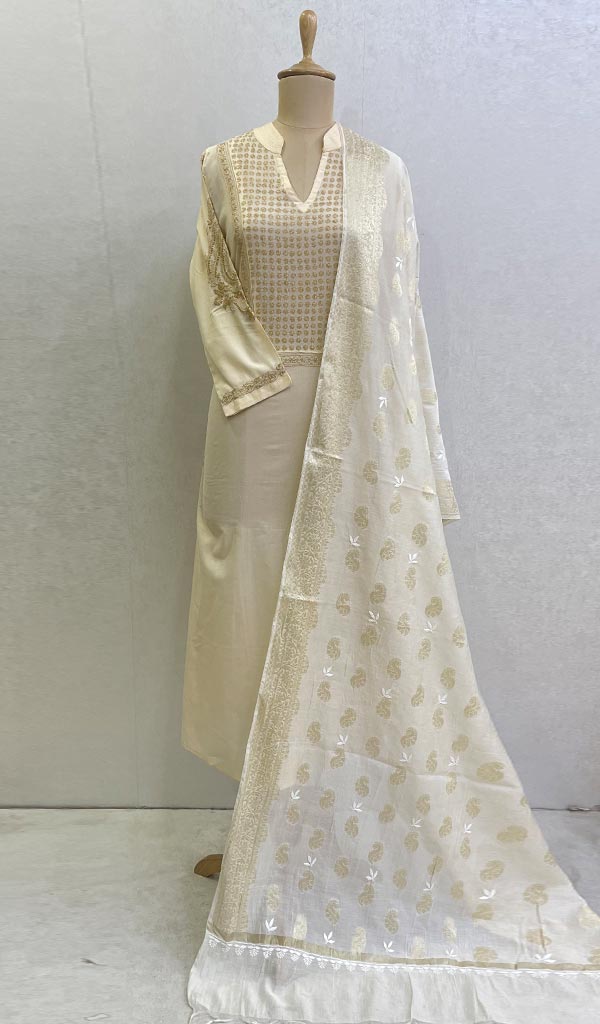 Lakhnavi 手工制作 Chanderi 丝绸 Chikankari Dupatta - Honc068129