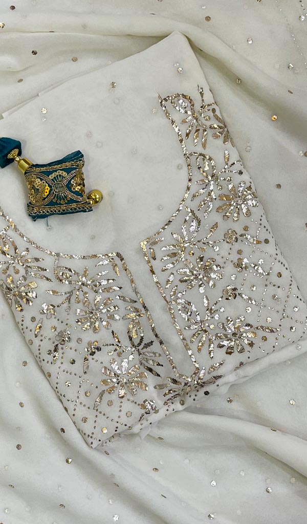 Lakhnavi Chikankari 套装的特点是,它们中的大多数都是独一无二的。一旦设计售空,几乎不可能在市场或网上的任何地方找到复制品,甚至类似的设计。这就是 Chikankari 西装面料的独特之处,就像这款一样。它由勒克瑙技艺精湛的工匠采用最优质的 chikankari 缝线制成。购买未缝合的 Chikankari 西装面料的优点是您可以根据您的个人风格对其进行缝合和定制。立即购买,拥抱 Nazrana 传统针线工艺之美,重新定义每件产品的精致。