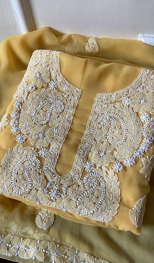 The thing about Lakhnavi Chikankari Suits is that most of them are one of a kind. Once a design is sold out, it’s almost impossible to find a replica or even a similar design anywhere in the market or online. This is what makes Chikankari suit fabrics unique just like this one. It’s made with the finest chikankari stitches by extremely skilled craftsmen of Lucknow. The advantage of buying an unstitched Chikankari suit fabric is that you can get it stitched and customized as per your personal style. Shop now and embrace the beauty of Nazrana’s heritage needlecraft, redefining sophistication with every product.