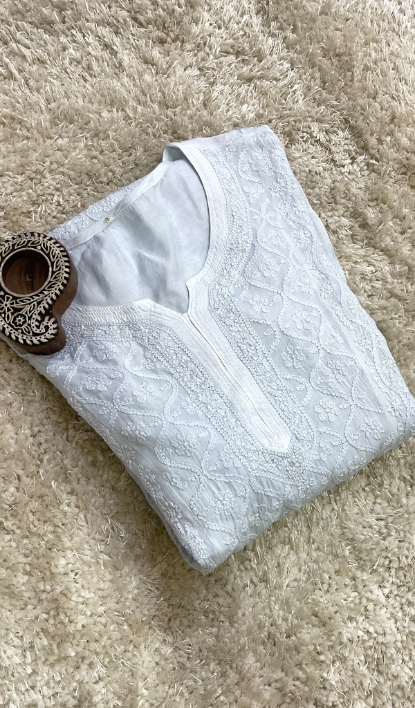 ]Lucknowi Chikankari kurtas have a charm and elegance that is unique to them. No other form of Indian hand embroidery has that. This delicately embroidered Long Kurti has intricate stitches of chikankari made on a frame by artisans. Usually kurtis like this one takes anywhere between 1 to 2 months to get ready out of which most time is consumed in the hand embroidery and hand printing process. If this is your first Chikankari kurti then be ready to fall in love with this heritage needlecraft and if it’s not your first then probably you’re already in love with the craft. Shop now and embrace the beauty of Nazrana’s heritage needlecraft, redefining sophistication with every product.