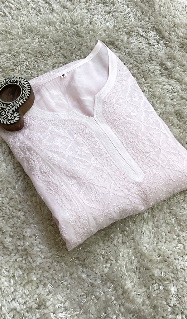 ]Lucknowi Chikankari kurtas have a charm and elegance that is unique to them. No other form of Indian hand embroidery has that. This delicately embroidered Long Kurti has intricate stitches of chikankari made on a frame by artisans. Usually kurtis like this one takes anywhere between 1 to 2 months to get ready out of which most time is consumed in the hand embroidery and hand printing process. If this is your first Chikankari kurti then be ready to fall in love with this heritage needlecraft and if it’s not your first then probably you’re already in love with the craft. Shop now and embrace the beauty of Nazrana’s heritage needlecraft, redefining sophistication with every product.