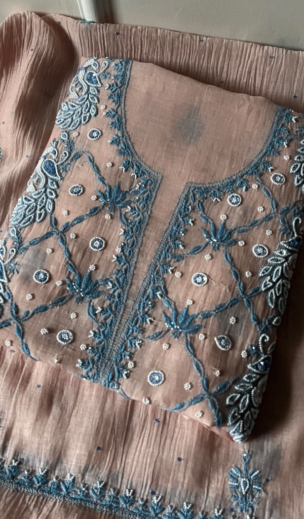 The thing about Lakhnavi Chikankari Suits is that most of them are one of a kind. Once a design is sold out, it’s almost impossible to find a replica or even a similar design anywhere in the market or online. This is what makes Chikankari suit fabrics unique just like this one. It’s made with the finest chikankari stitches by extremely skilled craftsmen of Lucknow. The advantage of buying an unstitched Chikankari suit fabric is that you can get it stitched and customized as per your personal style. Shop now and embrace the beauty of Nazrana’s heritage needlecraft, redefining sophistication with every product.