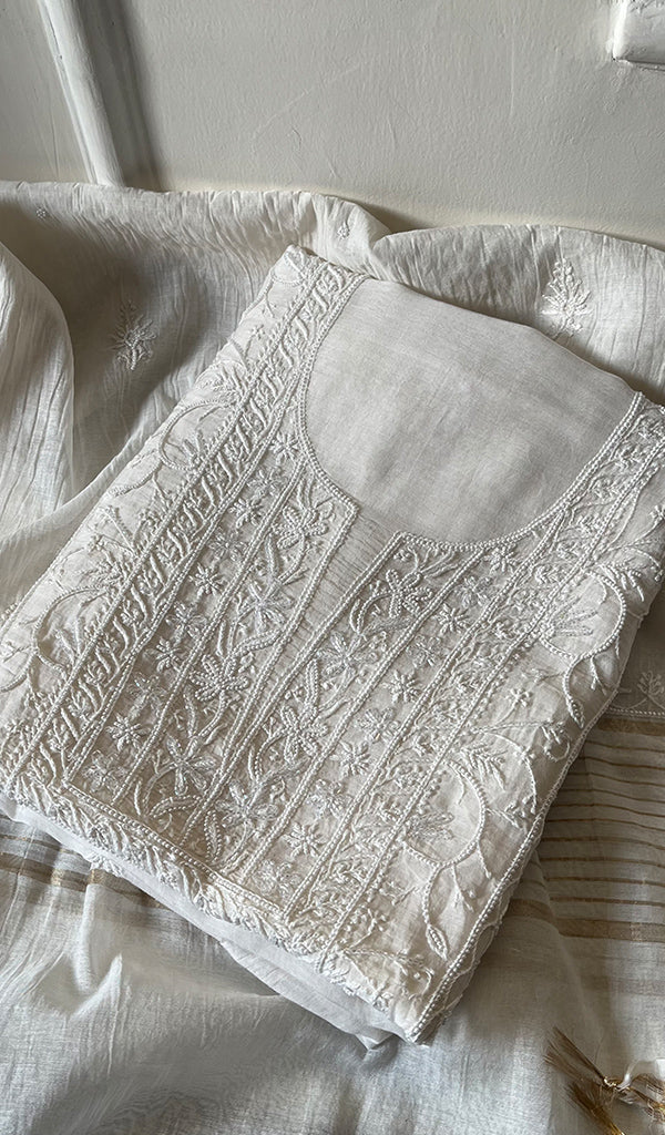 The thing about Lakhnavi Chikankari Suits is that most of them are one of a kind. Once a design is sold out, it’s almost impossible to find a replica or even a similar design anywhere in the market or online. This is what makes Chikankari suit fabrics unique just like this one. It’s made with the finest chikankari stitches by extremely skilled craftsmen of Lucknow. The advantage of buying an unstitched Chikankari suit fabric is that you can get it stitched and customized as per your personal style. Shop now and embrace the beauty of Nazrana’s heritage needlecraft, redefining sophistication with every product