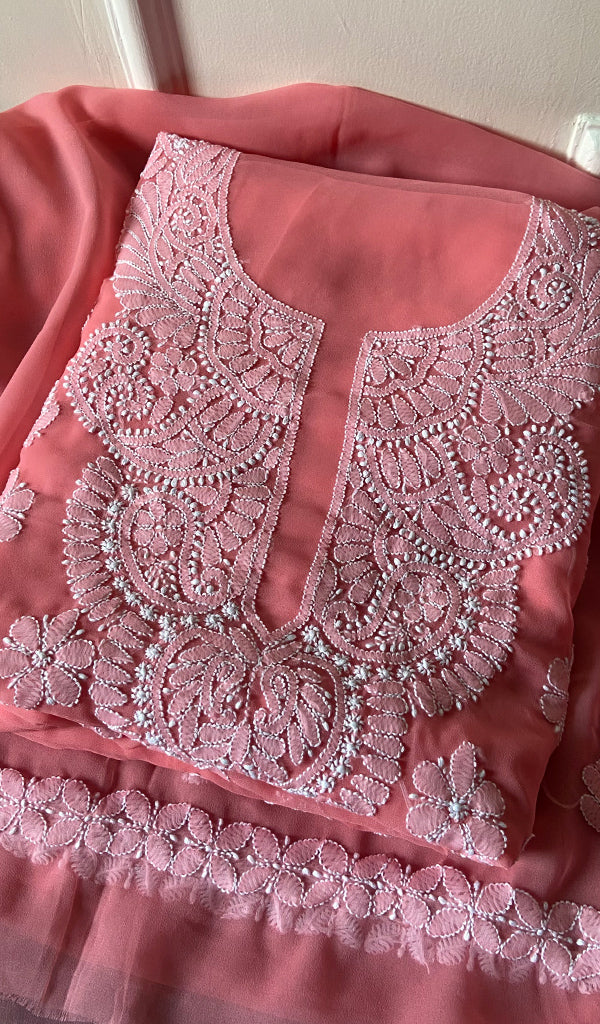 The thing about Lakhnavi Chikankari Suits is that most of them are one of a kind. Once a design is sold out, it’s almost impossible to find a replica or even a similar design anywhere in the market or online. This is what makes Chikankari suit fabrics unique just like this one. It’s made with the finest chikankari stitches by extremely skilled craftsmen of Lucknow. The advantage of buying an unstitched Chikankari suit fabric is that you can get it stitched and customized as per your personal style. Shop now and embrace the beauty of Nazrana’s heritage needlecraft, redefining sophistication with every product.