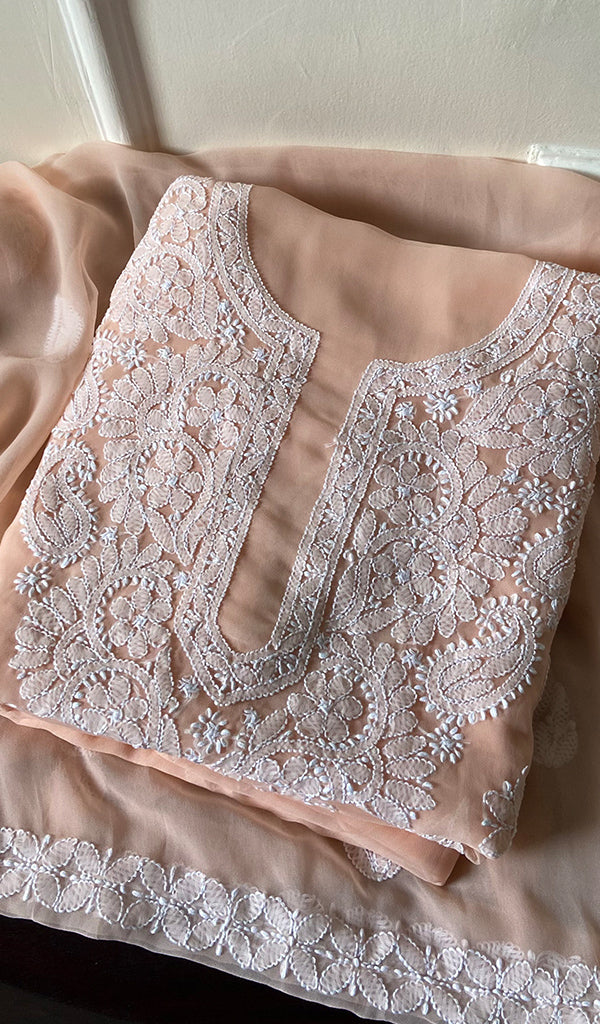 The thing about Lakhnavi Chikankari Suits is that most of them are one of a kind. Once a design is sold out, it’s almost impossible to find a replica or even a similar design anywhere in the market or online. This is what makes Chikankari suit fabrics unique just like this one. It’s made with the finest chikankari stitches by extremely skilled craftsmen of Lucknow. The advantage of buying an unstitched Chikankari suit fabric is that you can get it stitched and customized as per your personal style. Shop now and embrace the beauty of Nazrana’s heritage needlecraft, redefining sophistication with every product.