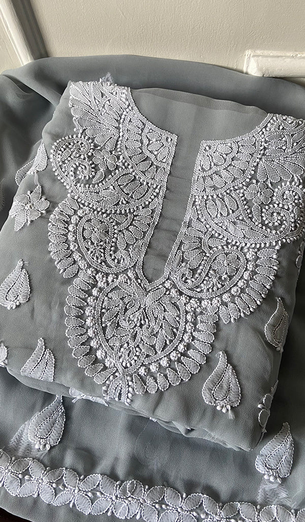The thing about Lakhnavi Chikankari Suits is that most of them are one of a kind. Once a design is sold out, it’s almost impossible to find a replica or even a similar design anywhere in the market or online. This is what makes Chikankari suit fabrics unique just like this one. It’s made with the finest chikankari stitches by extremely skilled craftsmen of Lucknow. The advantage of buying an unstitched Chikankari suit fabric is that you can get it stitched and customized as per your personal style. Shop now and embrace the beauty of Nazrana’s heritage needlecraft, redefining sophistication with every product.