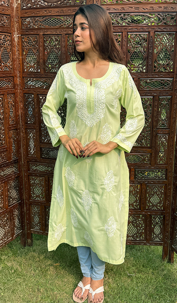 Lucknowi Chikankari kurtas have a charm and elegance that is unique to them. No other form of Indian hand embroidery has that. This delicately embroidered Long Kurti has intricate stitches of chikankari made on a frame by artisans. Usually kurtis like this one takes anywhere between 1 to 2 months to get ready out of which most time is consumed in the hand embroidery and hand printing process. If this is your first Chikankari kurti then be ready to fall in love with this heritage needlecraft and if it’s not your first then probably you’re already in love with the craft. Shop now and embrace the beauty of Nazrana’s heritage needlecraft, redefining sophistication with every product.